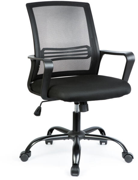 Modern megjelenésű, kényelmes irodai forgószék fekete színben, amely ideális választás otthoni vagy munkahelyi környezetbe. Ergonomikus kialakításának és állítható magasságának köszönhetően hosszabb ülések esetén is komfortos használatot biztosít. A háttámla és a karfák erős, de rugalmas anyagból készültek, míg az ülőfelület strapabíró rétegelt lemezre épül. A szék pillangómechanikával, gázlifttel és fém lábcsillaggal van ellátva, amely stabilitást és tartósságot garantál.