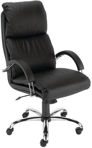 Menedzser karosszék irodai terekbe dizájnértékű faelemekkel. Fekete bőr támla és ülőlap kárpit. Állítható magasságú ülőlap. Erős fém kartámlák bőr bevonattal. Acélfényes kereszttalp.